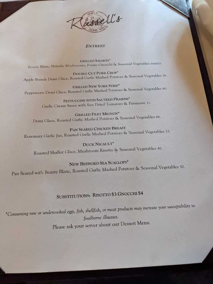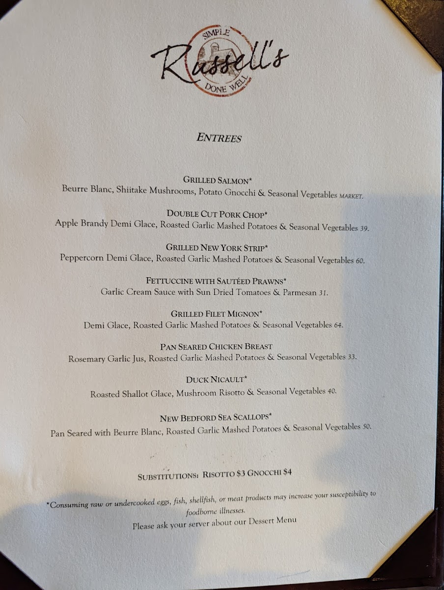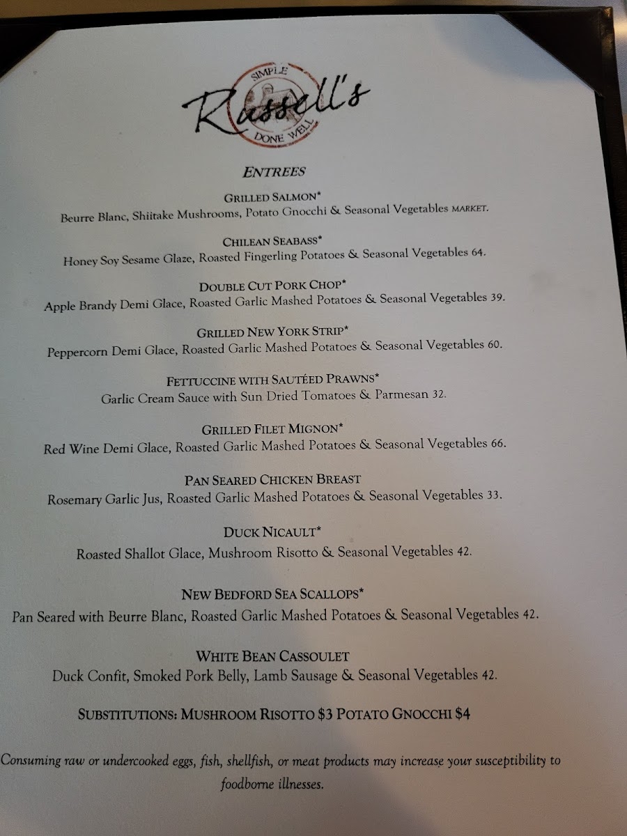 The entrées at Russell's are where the kitchen truly shines. The famed White Bean Cassoulet, overflowing with duck confit, smoked pork belly, lamb sausage, and seasonal vegetables, promises to carry your taste buds on a heartfelt journey through layers of flavor. For those who savor pork, the Double Cut Pork Chop—grilled to perfection and drizzled with apple brandy demi-glace—accompanies roasted garlic mashed potatoes and seasonal vegetables in a dish that evokes a sense of comfort alongside gourmet sophistication. Alternatively, the Fettuccine with Sautéed Prawns, bathed in a rich garlic cream sauce with sun-dried tomatoes, speaks to the restaurant’s knack for blending fresh ingredients with classic techniques.